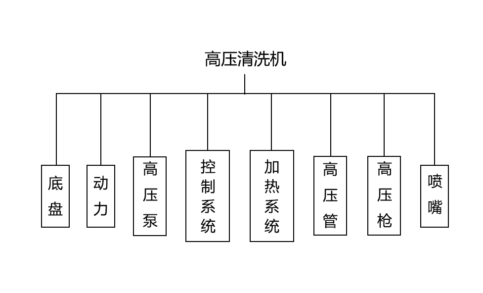 高壓清洗機(jī)組成部分:底盤(pán)-動(dòng)力-高壓泵-控制系統(tǒng)-高壓管-高壓槍-噴嘴。