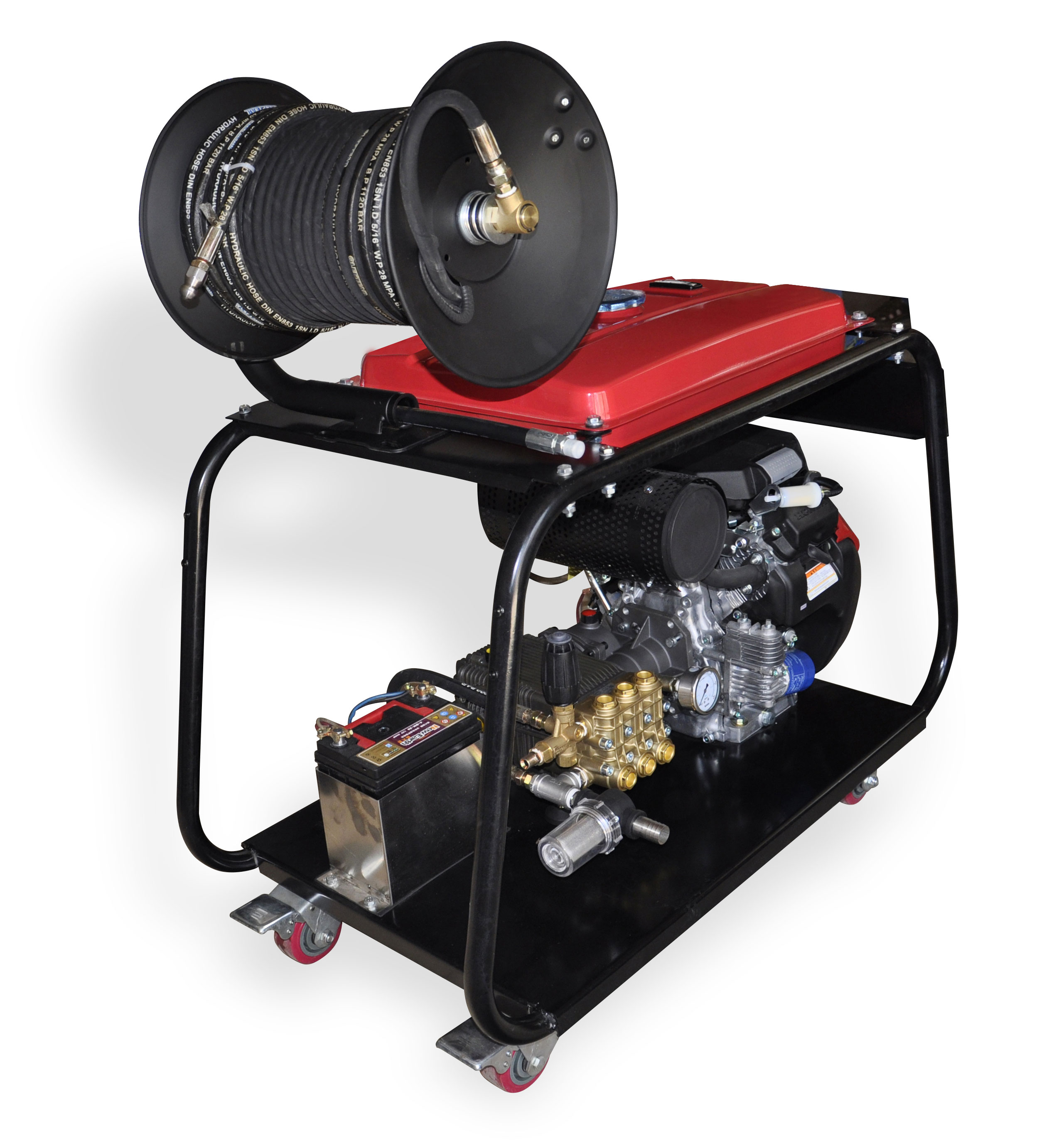 高壓疏通機原理:利用汽油機、柴油機或者電機通過傳動軸帶動柱塞泵把水加壓到幾十公斤,幾百公斤甚至上千公斤。通過特殊的噴頭噴出,打擊在管道內(nèi)壁上,使管道內(nèi)壁上的污垢、油污、皂化物、料垢等清洗下來。再通過噴射在管道里激流水把被清洗物沖出管外,達到徹底清洗管道目的。