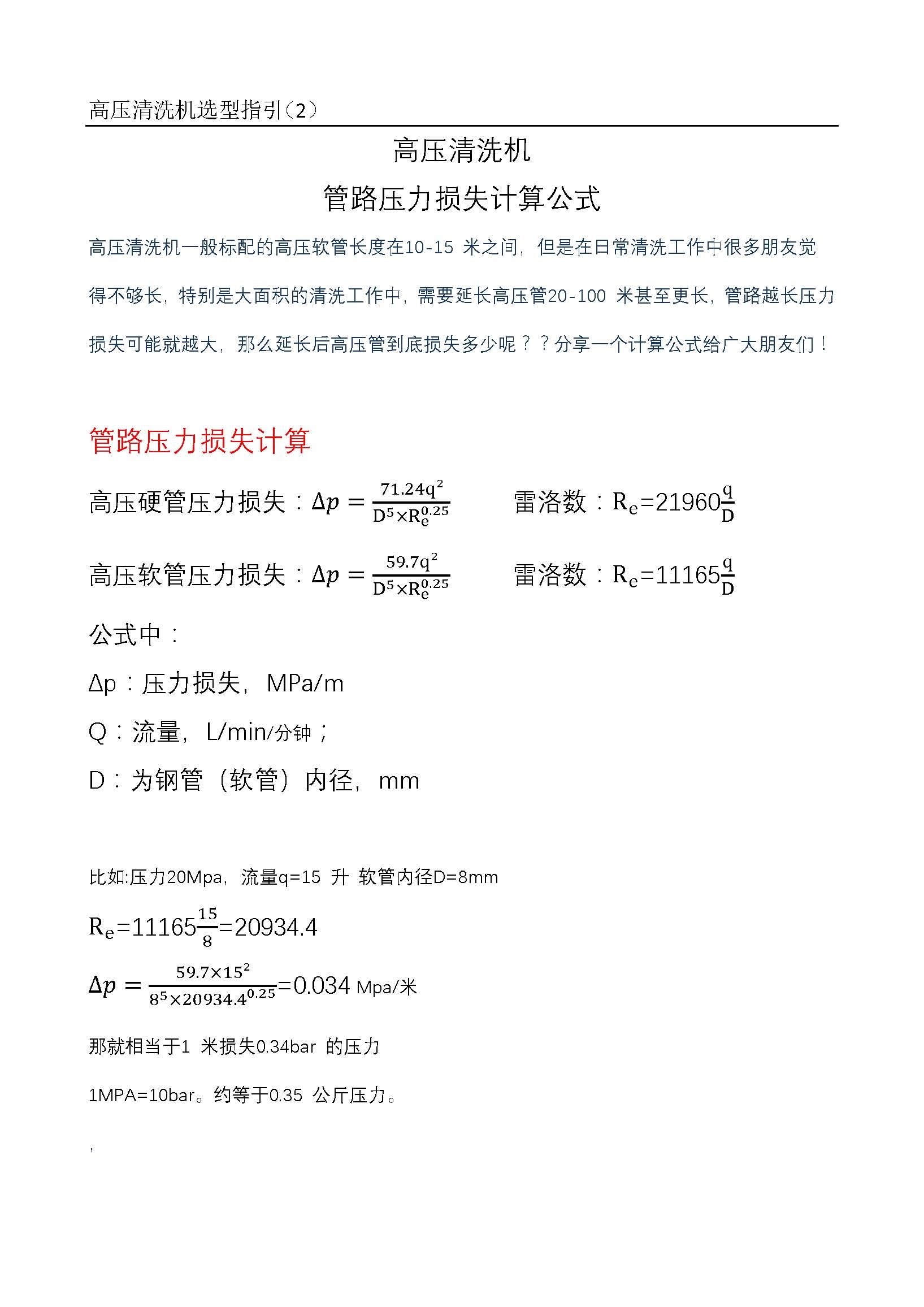 我們在使用高壓水清洗機(jī)進(jìn)行射流清洗作業(yè)時,大部分人都忽視了壓力的損失,但是高壓水清洗機(jī)在實際作業(yè)中,高壓水流經(jīng)高壓膠管、連接接頭與旋轉(zhuǎn)體等不同阻力的截面均會造成壓力損失,而導(dǎo)致壓力損失的關(guān)鍵因素是流量系數(shù)而不是所使用的壓力。液體流經(jīng)高壓膠管的直徑與長度的流量系數(shù)決定最終所損失的壓力。