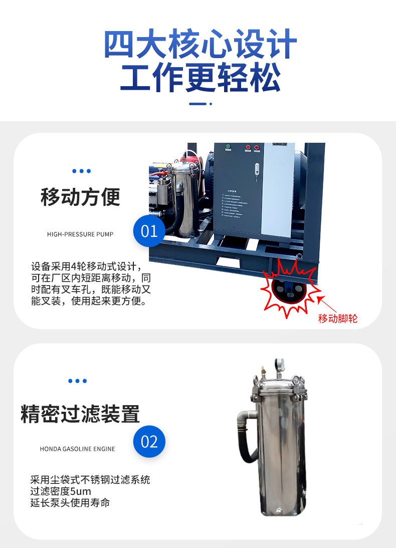 2800公斤柴油機(jī)超高壓清洗機(jī),大壓力、大流量,適用于除漆除銹、冷凝器、換熱器等工業(yè)列管清洗和疏通,大輪牽引方便于在車(chē)間內(nèi)隨意移動(dòng)。